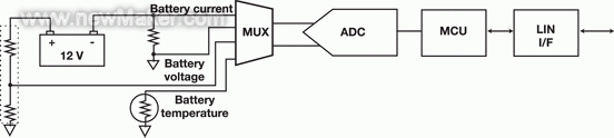 現(xiàn)在的汽車十分依賴電子產(chǎn)品同時也是對電池的依賴。持續(xù)不斷的監(jiān)視對于電池的條件來說非常重要,這關(guān)系到汽車的可靠性。每5輛報廢的汽車中就有一輛是由于電池的原因造成的。近些年來,當(dāng)像電傳線控,發(fā)動/熄火引擎管理和液壓(電子/氣體)助力這些系統(tǒng)汽車技術(shù)普遍使用時,這個問題變的越來越嚴(yán)重。降低錯誤的數(shù)量,需要精確的感應(yīng)到電池的電壓,電流和溫度;對結(jié)果進(jìn)行預(yù)處理;計算電荷狀況和性能狀況,將結(jié)果發(fā)送到ECU;然后控制充電功能。