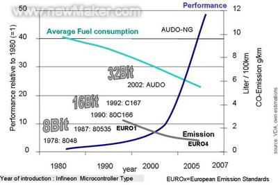 動力系統(tǒng)的革新和進步,往往和排放法規(guī)的推出聯(lián)系在一起。作為動力系統(tǒng)革新的推動力,新的排放法規(guī)的出臺總是推動著動力系統(tǒng)的更新?lián)Q代。為了達到歐2的標準,8位微處理器就足以滿足要求。英飛凌的8位微處理器C505今天依然被廣泛的使用在這樣的系統(tǒng)中。從90年代初開始,由于系統(tǒng)對于微處理器要求的提高,16位微處理器逐漸開始應用在動力系統(tǒng)當中。英飛凌16位微處理器C167以卓越的實時處理能力在市場上得到了廣泛的認可。從而在汽車的嵌入式系統(tǒng)中得到了非常廣泛的應用。