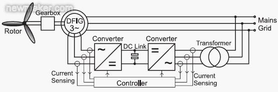 現(xiàn)在大多數(shù)的風(fēng)力渦輪機都使用一種經(jīng)過修正的“丹麥概念”,在這種概念中,一臺雙饋異步機器作為發(fā)電機。
