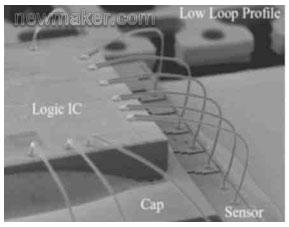 在堆疊結(jié)構(gòu)中,先用膠合膜將傳感器裸片焊到一個(gè)表面積很大的基片上(圖4)。半導(dǎo)體裸片和MEMS裸片堆疊放置可使封裝變得很小(圖5)。使用絲焊方法連接兩顆裸片的電觸點(diǎn),然后,再用注塑封裝技術(shù)封裝裸片。這種封裝方法可以在大面積的基片完成,因此成本相對(duì)較便宜。封裝應(yīng)力特別是粘接和注塑過(guò)程產(chǎn)生的應(yīng)力曾經(jīng)是這項(xiàng)封裝技術(shù)的一大挑戰(zhàn),意法半導(dǎo)體成功地解決了這個(gè)難題。圖6描述了意法半導(dǎo)體的超緊湊型線性加速計(jì)封裝的進(jìn)化歷程,線性加速計(jì)廣泛用于消費(fèi)電子產(chǎn)品。