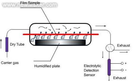 傳感器法依照所采用的傳感器種類的不同分為紅外傳感器法、電解法以及動(dòng)態(tài)相對(duì)濕度測(cè)定法。其中紅外傳感器法與電解法的檢測(cè)結(jié)構(gòu)相近,原理相似,都是將試樣密封在上下測(cè)試腔中,利用飽和鹽溶液將試樣的一側(cè)控制為高濕的狀態(tài),而另一側(cè)用干燥氣體吹掃以保持干燥,這樣試樣兩側(cè)就形成了特定的濕度差。透過(guò)試樣進(jìn)入干燥側(cè)的水蒸氣被干燥氣流攜帶進(jìn)入傳感器中測(cè)定其中的水分含量以判斷試樣的透濕量;谶@兩種檢測(cè)原理的設(shè)備工作獨(dú)立性都很好,而且所需的測(cè)試腔體積非常小,使得控溫控濕易于進(jìn)行。動(dòng)態(tài)相對(duì)濕度測(cè)定法的檢測(cè)原理與紅外傳感器法以及電解法有一定差別,在這種方法中溫度控制也易于實(shí)現(xiàn),而試樣兩側(cè)的濕度差根據(jù)測(cè)試原理在整個(gè)測(cè)試過(guò)程中都是在不斷變化的。