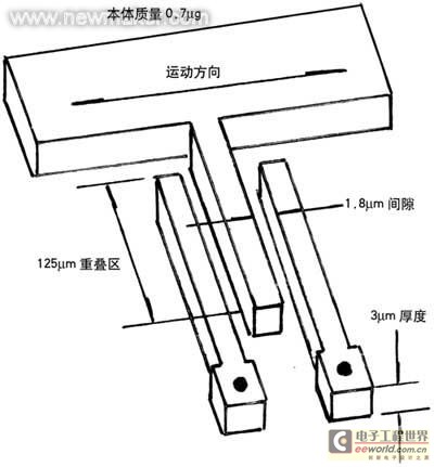 最新一代加速計(jì)傳感器都是單芯片的,如AD公司的ADXL 202E集成EMES加速計(jì),它是目前已批量生產(chǎn)的小型、廉價(jià)、低重力集成化雙軸加速計(jì)。圖1是ADXL202E機(jī)械結(jié)構(gòu)的示意圖。MEMS結(jié)構(gòu)用多晶硅彈簧懸掛在襯底上,傳感器本體可沿X軸和Y軸移動(dòng)。四方形傳感器本體四周設(shè)有32組徑向指狀橫桿。這些指狀橫桿處于固定在襯底上的兩條平板之間。每條指狀橫桿一對(duì)固定板組成一個(gè)差動(dòng)電容。傳感器本體相對(duì)子中心位置的任何偏離通過差動(dòng)電容的測(cè)量來確定。這種傳感器既能測(cè)量動(dòng)態(tài)加速度(如沖擊或震動(dòng)),也能測(cè)量靜態(tài)加速度(如傾角或重力)。