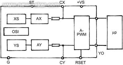 圖2是ADXL202E的總體方框圖。差動(dòng)電容是采用同步調(diào)制/解調(diào)技術(shù)測(cè)量的。放大后的X軸和Y軸加速度信號(hào)分別通過32KΩ電阻加至CX和CY輸出引腳以及PWM調(diào)制器。在CX和CY引腳處增加電容能限制帶寬,從而降低噪聲電平。PWM與加速度成正比,其輸出可直接送至微處理器的數(shù)字輸入端,用計(jì)數(shù)器解調(diào)PWM信號(hào)。