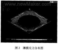 利用有限元分析軟件ANSYS對接觸式結構的薄膜工作狀態(tài)進行了模擬。材料為Si,膜的形狀為正方形,邊長1000 μm,膜厚5 μm,極板間距10 μm。在1.01×105Pa的大氣壓力下,薄膜中央接觸部分及四個邊角基本不受應力,四邊中央應力最大為1.07 MPa,小于硅的屈服應力7 MPa,其應力分布如圖2所示。