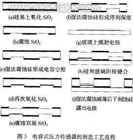 整個制造流程都采用標準工藝,如圖3所示。先熱氧化100 nm的SiO2,既作為腐蝕Si的掩膜,又作為電容兩電極的絕緣層。利用各向異性腐蝕形成電容空腔和將來露電極的?滩,如果硅片厚度一致且KOH腐蝕速率均勻,此法可以在相當程度上等效于自停止腐蝕。從玻璃上引出電容兩電極,然后和硅片進行陽極鍵合。鍵合片利用KOH腐蝕減薄后反應離子深刻蝕露出測量電極。