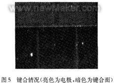 目前真空腔的形成多采用Si—Si鍵合或者陽極鍵合。本方案采用陽極鍵合,是因為陽極鍵合比Si—Si鍵合的要求低。首先溫度只需要400~500℃,其次表面光潔度要求也相對較低。本工藝過程中存在金屬電極,不適于用高溫;鍵合面存在高約1400 nm,寬為20μm的電極引線,鍵合面的SiO2經(jīng)過一定程度的KOH各向異性腐蝕后粗糙度為100nm左右,經(jīng)過試驗證明,鍵合情況良好(圖5),并具有良好的密封效果。