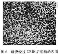 反應離子深刻蝕(DRIE)能刻出非常深的垂直結構,本試驗用于最后硅薄膜的形成。DRIE的刻蝕效果(刻深為250 μm)沒有KOH腐蝕的平坦,刻蝕表面比較粗糙,表面顆粒起伏為幾個微米,如圖6。此外刻蝕存在不均勻性,75 mm硅片四周已經(jīng)刻到電極露出,而硅片中央的電極還沒有露出。深刻蝕的不均勻性與刻蝕表面的圖形有著密切的聯(lián)系,但其中的成因和機理目前還沒有具體合理的理論和解釋說明。因而無法從理論上指導規(guī)劃刻蝕表面的形狀設計,更多的是依靠經(jīng)驗手動凋整。
