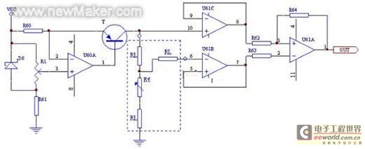 該電路完全消除了最常用的三線制接法[2]中導(dǎo)線電阻的影響。圖中R62、R63、R64的電阻值相等,其輸出電壓僅與熱電阻Rt有關(guān),且呈線性關(guān)系。測(cè)量精度主要取決于恒流源電流。為保證該電流的穩(wěn)定性,在恒流源電路的設(shè)計(jì)中,選用了穩(wěn)壓管(LM-336),高精度低漂移運(yùn)算放大器(OP-07),晶體三極管(BC157B)。其它電路則選用了四通用單電源運(yùn)算放大器(LM324)。