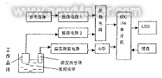 工作晶體相對參考晶體的頻率偏移,由差頻電路獲得,并輸入80C196的HSI測量其頻率的大小。被測液體溫度經檢測電路和A/D轉換輸入單片機系統(tǒng)。被測液體密度值由鍵盤輸入。
