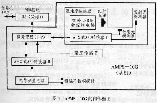 APMS-10G中的微處理器主要用于將4路信號(發(fā)射信號、散射信號、電導(dǎo)信號和溫度信號)轉(zhuǎn)換成數(shù)字信號,并通過rS-232串行接口將數(shù)據(jù)傳輸給外部主控制器。該傳感器沒有模擬信號輸出,必要時,用戶可通過外部Δ-Σ式D/A轉(zhuǎn)換器來獲得傳感器的模擬輸出。