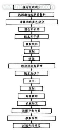 用常規(guī)陶瓷工藝生產(chǎn)的原始材料是氧化物(例如Al2O3,TiO2,ZnO,SnO2,BaO,SrO或CoO),或是碳酸化合物(例如BaCO3,SrCO3,Na2CO3或MnCO3)。其制造過程的流程框圖示于圖1。