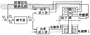 圖1是軸向磁懸浮軸承系統(tǒng)的結(jié)構(gòu)圖,圖中轉(zhuǎn)子的軸向位置由系統(tǒng)控制器(包括位移傳感器、調(diào)節(jié)器的功率放大器)精密地控制。當(dāng)轉(zhuǎn)子由于受到外來干擾力或其他原因出現(xiàn)軸向位移時(shí),位移量由位移傳感器測出,經(jīng)位移信號轉(zhuǎn)換電路轉(zhuǎn)換成相應(yīng)的電壓信號ux,與參考信號ur比較后得到差值信號ue,再由調(diào)節(jié)器進(jìn)行幅值和相位的校正,得到的信號電壓uc被功率放大器和電磁鐵轉(zhuǎn)換成相應(yīng)的電磁力,使轉(zhuǎn)子恢復(fù)到設(shè)定的位置上。