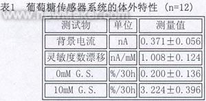 本系統(tǒng)的體外特性如表1。背景電流較其他文獻(xiàn)報(bào)告更低〔4〕,與Y.Haslugrocli等的相同〔3〕,均是至今報(bào)告中最低的。30小時(shí)的漂移值未見(jiàn)報(bào)道。5.5mM G.S.中測(cè)試24小時(shí)所得最低漂移值為0.255%-1mM-1h〔5〕,本研究10mMG.S.中測(cè)試30小時(shí)的漂移值為0.103%-1mM-1h。由于G.S.濃度越高,傳感器運(yùn)行時(shí)間越長(zhǎng),其漂移程度越明顯,所以本組的結(jié)果是迄今為止報(bào)告的最低值,且意義更大。