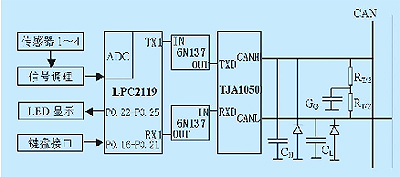 人機(jī)接口利用lpc2119豐富的gpio接口采用led顯示輸出和鍵盤(pán)輸入,如圖2所示。本設(shè)計(jì)采用4個(gè)led分別表示節(jié)點(diǎn)電源、數(shù)據(jù)通信狀態(tài)、聯(lián)機(jī)指示和錯(cuò)誤指示。鍵盤(pán)設(shè)計(jì)了6個(gè)按鍵用來(lái)設(shè)置節(jié)點(diǎn)的報(bào)文濾波、節(jié)點(diǎn)的波特率及節(jié)點(diǎn)復(fù)位等功能。