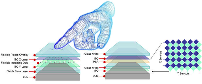 阻性觸摸屏包括有一個(gè)柔性頂層,然后是一層ITO,一個(gè)空氣隙,然后是另一層ITO。面板有4根線附到ITO層上:“X”層的左右側(cè)各一根,“Y”層的頂端和底端各一根。