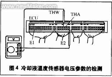 (2)若電壓值不在此范圍內,可參照圖 5所示對ECU進行檢測,方法同冷卻液溫度傳感器電壓參數(shù)的檢測的第“(2)”項、第“(3)”項。