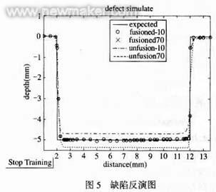 對一個長10 mm,深5 mm的標準矩形缺陷進行檢測,在兩個典型溫度點下的網(wǎng)絡輸出見圖4。圖中實線是期望的輸出,兩條虛線分別是70℃和-10℃下,未融合的輸出,“ ○”線和“+”線是這兩個溫度點下融合后的輸出。由圖可見,融合前的兩條輸出波形偏離目標曲線,而且表示缺陷特征的波峰波谷的水平和豎直間距與目標值有一定的差距。融合后的輸出與期望值幾乎重合,補償效果顯著。圖5是反演后的缺陷圖。線型的意義與圖4相同。-10℃和70℃下的數(shù)據(jù)融合后反演出的缺陷與實際缺陷基本重合。未融合數(shù)據(jù)反演出的缺陷與實際缺陷深度有偏差。
