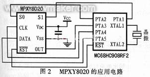 在汽車輪胎壓力檢測系統(tǒng)中,每個輪胎中安裝一個從機,從機由MPXY8020、帶RF發(fā)射模塊的MCU(MC68HC908RF2)和電池組成。主機設(shè)置在汽車駕駛室內(nèi),用以接收從機發(fā)射的信號。主要從機需放置在輪胎內(nèi),所以要求體積小、功耗低。圖2為MPXY8020的應(yīng)用電路。MC68H908RF2型單片機帶有一個RF發(fā)射模塊,因此無需外加RF發(fā)射電路,縮小了系統(tǒng)的體積。
