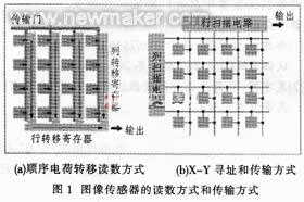 目前CCD和CMOS常用的讀數(shù)方式:順序電荷轉(zhuǎn)移方式與X-Y導(dǎo)址和傳輸方式。圖1(a)為傳統(tǒng)Interline CCD圖像傳感器通常采用的順序電荷轉(zhuǎn)移方式由光信號轉(zhuǎn)換成的電信號首先被傳送到列轉(zhuǎn)移寄存器,最后再輸出到圖像處理單元,因此速度受到限制。此外從理論上講,由于順序電荷轉(zhuǎn)移方式需要連續(xù)、高速的驅(qū)動轉(zhuǎn)換寄存器,這就需要較多的電功率。圖1(b)為CMOS圖像傳感器通常使用的X-Y尋址和傳輸方式,在這種方式中,每一個(gè)像素都有自己的放大器,通過列掃描和行掃描來傳遞信號,并輸出給圖像處理單元。它有獨(dú)立的數(shù)據(jù)傳輸線路,因此能達(dá)到很高的速度,但是如果仔細(xì)觀察其輸出圖像,就能夠發(fā)現(xiàn)在分開的線上容易出現(xiàn)圖像失真。
