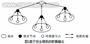 如圖2所示,基于安全模板的數(shù)據(jù)融合機(jī)制,是通過少量數(shù)據(jù)傳輸替代大量數(shù)據(jù)傳輸?shù)姆椒▉砀M(jìn)一步地降低簇內(nèi)的網(wǎng)絡(luò)通信量[5]。其中,傳感器節(jié)點(diǎn)并不直接傳輸采集數(shù)據(jù),而是用從簇首節(jié)點(diǎn)接收到的安全模板生成采集數(shù)據(jù)的組合代碼后再上傳;簇首節(jié)點(diǎn)接收到傳感器節(jié)點(diǎn)上傳的代碼數(shù)據(jù),檢查冗余后有選擇地向部分傳感器節(jié)點(diǎn)申請(qǐng)傳輸實(shí)際數(shù)據(jù),以有效降低簇內(nèi)的網(wǎng)絡(luò)通信量。最后,簇首節(jié)點(diǎn)從選定的傳感器節(jié)點(diǎn)接收到無冗余的采集數(shù)據(jù)并直接上傳基站。