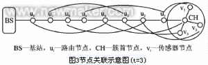 為盡早檢出和丟棄由被攻擊節(jié)點(diǎn)注入的虛假數(shù)據(jù)包,以達(dá)到安全需要和降低由此產(chǎn)生的能源消耗,文獻(xiàn)[7]將交互驗(yàn)證的思想進(jìn)一步擴(kuò)展,在簇首節(jié)點(diǎn)到基站的數(shù)據(jù)傳送鏈路上的各個(gè)節(jié)點(diǎn)間建立關(guān)聯(lián)關(guān)系,如圖3所示,從而所有節(jié)點(diǎn)以一種交錯(cuò)的逐跳方式驗(yàn)證其要傳遞的數(shù)據(jù)包。只有t+1(t是設(shè)定的安全上限,取簇內(nèi)的節(jié)點(diǎn)數(shù))個(gè)節(jié)點(diǎn)全部通過認(rèn)證,數(shù)據(jù)包才能被傳遞到基站,因此,只要被攻擊的節(jié)點(diǎn)數(shù)小于等于t,基站或沒有被攻擊的節(jié)點(diǎn)就能檢測(cè)出并丟棄由入侵者注入的虛假數(shù)據(jù)包。