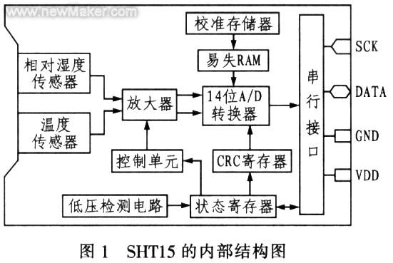 SHT15型傳感器是單片、多用途的智能傳感器,其中不僅包含基于濕敏電容器的微型相對(duì)濕度傳感器和基于帶隙電路的微型溫度傳感器,而且還有14位的A/D轉(zhuǎn)換器和2線串行接口。能輸出經(jīng)過校準(zhǔn)的相對(duì)濕度和溫度的串行數(shù)據(jù),所以系統(tǒng)中不再使用傳統(tǒng)設(shè)計(jì)需要的多路轉(zhuǎn)換開關(guān)、A/D轉(zhuǎn)換器及信號(hào)調(diào)理電路,系統(tǒng)結(jié)構(gòu)比較緊湊和簡(jiǎn)單,SHTl5能在同一位置測(cè)量相對(duì)濕度和溫度。它的內(nèi)部結(jié)構(gòu)如圖1所示。