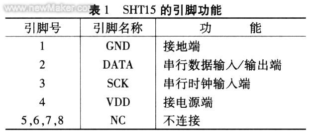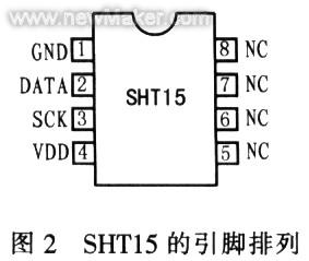 SHT15的引腳比較少.使用方便。其引腳排列如圖2所示。引腳功能如表1所示。SHT15型智能傳感器的相對(duì)濕度測(cè)量范圍是0~100%。分辨率達(dá)0.03%,最高精度為+2%RH,溫度測(cè)量范圍是—40℃一十123.8℃.分辨率為0.1℃.電源電壓范圍是+2.5V一+5.5V.響應(yīng)時(shí)間小于3s。