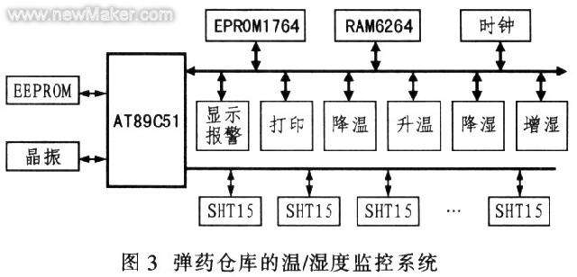 AT89C51和SHT15之間通過串行總線進(jìn)行通信.執(zhí)行機(jī)構(gòu)主要由電機(jī)控制的降溫機(jī)、升溫機(jī)、降濕機(jī)、增濕機(jī)等組成。彈藥倉庫的溫/濕度監(jiān)控系統(tǒng)如圖3所示。