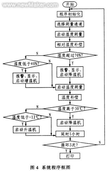 每次測(cè)得的數(shù)據(jù)要和規(guī)定值進(jìn)行比較,如果在允許的范圍內(nèi),則程序進(jìn)行下一步操作,如果不滿足要求.則應(yīng)報(bào)警并將此刻的數(shù)據(jù)值顯示出來,在每次循環(huán)結(jié)束后。要經(jīng)過1個(gè)小時(shí)(可以靈活選用)的延時(shí).這主要是因?yàn)閺椝巶}庫里有很多木制結(jié)構(gòu),揮發(fā)和吸收水分都有一個(gè)過程,經(jīng)過一定延時(shí)再進(jìn)行測(cè)量.可以避免傳感器長時(shí)間的工作和執(zhí)行機(jī)構(gòu)的反復(fù)啟停,節(jié)約資源,同時(shí)可以延長系統(tǒng)的使用壽命。每經(jīng)過3次(根據(jù)需要可以適當(dāng)選擇)循環(huán)測(cè)量后,單片機(jī)控制打印機(jī)將3次測(cè)量的溫/濕度數(shù)據(jù)打印出來,便于報(bào)表和存檔。