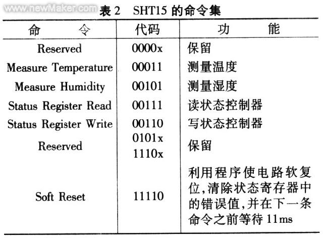 由于SHTl5中含有存儲(chǔ)器,所以設(shè)置初始化程序主要是對(duì)單片機(jī)和SHTl5的存儲(chǔ)器中的一些數(shù)據(jù)置初值,同時(shí)對(duì)單片機(jī)的初態(tài)進(jìn)行初始化。該系統(tǒng)是多通道的測(cè)量系統(tǒng).SHTl5上電后經(jīng)過10ms時(shí)間就進(jìn)入休眠狀態(tài),只有當(dāng)單片機(jī)發(fā)出測(cè)量命令后,SHTl5才被“喚醒”而進(jìn)行工作,所以.單片機(jī)循環(huán)對(duì)各個(gè)傳感器發(fā)出溫,濕度測(cè)量命令,實(shí)現(xiàn)多通道的溫,濕度測(cè)量。SHTl5的命令集如表2所列。