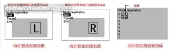 在下一級菜單中選擇model registration,然后選擇registration開始登錄標準球頭銷畫面,接著選擇box(登錄矩形的畫面)和or(登錄的畫面以或的形式與標準畫面比較),最后選擇Add(增加登錄區(qū)域)將出現(xiàn)圖4(a)所示的矩形選擇框。拖動選擇框?qū)⑵浞胖迷谟卿泩D形的合適位置,然后回車改變其大小,使選擇框剛好將欲登錄圖形圈住,再次回車之后選擇End,一個左球頭銷標準圖形就登錄完畢了。如果左球頭銷有多種樣式,則可以將每種樣式的球頭銷都登錄到0號索引號之后,但最多不超過5種。按照同樣的方式將右球頭銷登錄在1號索引號之后,同樣也可以登錄不超過5種不同樣式的右球頭銷,如圖4(b)所示。圖4(c)為左右球頭銷全部登錄完成后的畫面。
