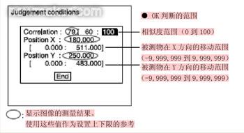 在搜索范圍設置完成后,返回到上一級菜單中,選擇judgement conditions將出現(xiàn)在圖6所示畫面?梢酝ㄟ^小控制器更改畫面中的合格相似度范圍,允許的XY方向移動范圍。圖6中允許的相似度范圍設定在60%~100%之間,實際檢測結(jié)果為79%,中心坐標的X方向值和Y方向值也都在設定的允許范圍之內(nèi),這說明當前球頭銷與已登錄的一個標準球頭銷的相似度在所設置的合格范圍之內(nèi),那么就認為當前球頭銷與該標準球頭銷屬于同一類別,即同一索引號。此時視覺控制器便通過相應的輸出端子輸出該索引號。