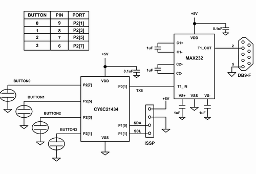 為了實(shí)現(xiàn)電容式傳感和串行通信,該電路采用了賽普拉斯的CY8C21x34系列中的PSoC IC芯片。該芯片包含一組模擬和數(shù)字功能塊,這些功能塊可由存儲(chǔ)于板上閃存中的固件來配置。另一顆芯片負(fù)責(zé)處理RS232的電平移位,以便建立到主機(jī)的通信鏈接,并實(shí)現(xiàn)波特率為115,200的電容式傳感數(shù)據(jù)記錄。四個(gè)電容傳感按鍵的引腳分配在圖5的表中給出。PSoC是通過一個(gè)包含電源、地以及編程引腳SCL和SDA的ISSP接頭來實(shí)現(xiàn)編程的。而通過一個(gè)DB9連接器將電腦與電容式傳感電路板相連。