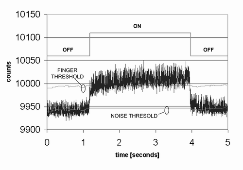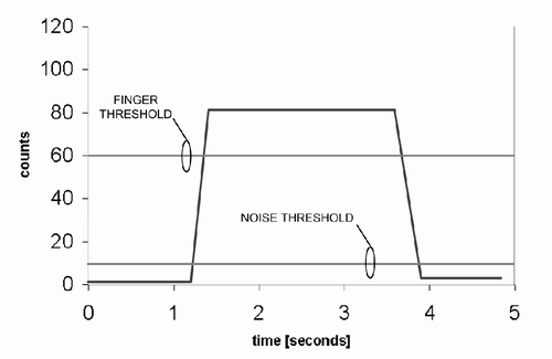 噪聲門限被設(shè)定的計(jì)數(shù)值為10,而手指門限設(shè)定的計(jì)數(shù)值則為60。實(shí)際上,在實(shí)際計(jì)數(shù)數(shù)據(jù)中噪聲分量是始終存在,圖中沒有顯示是為了能清晰地顯示門限水平。