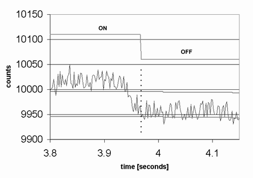 差分計(jì)數(shù)是通過主PC上一個(gè)終端仿真程序獲得,然后借助電子制表軟件繪制而成的。將手指在10mm厚的玻璃覆蓋層上按壓3秒。按鍵的開關(guān)狀態(tài)會(huì)被疊加在原始計(jì)數(shù)上。按鍵在這兩種狀態(tài)之間快速轉(zhuǎn)換,哪怕是由于通過厚玻璃進(jìn)行檢測(cè)而使原始計(jì)數(shù)信號(hào)中具有較大的噪聲時(shí)也是如此。請(qǐng)注意手指和按鍵門限隨著基線的漂移而進(jìn)行周期性調(diào)整。當(dāng)檢測(cè)到手指的觸壓動(dòng)作時(shí),基線值將鎖定,直到手指移開為止。