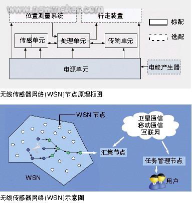 不同種類(lèi)的傳感器將探測(cè)到的相應(yīng)的物理量,經(jīng)過(guò)模擬/數(shù)字轉(zhuǎn)換后,送到處理單元。處理單元負(fù)責(zé)處理本節(jié)點(diǎn)和其他節(jié)點(diǎn)傳來(lái)的數(shù)據(jù),而傳輸單元?jiǎng)t按照相應(yīng)的無(wú)線(xiàn)傳輸協(xié)議與其他節(jié)點(diǎn)交換數(shù)據(jù)。選配的位置測(cè)量系統(tǒng)通常是由多普勒測(cè)距系統(tǒng)擔(dān)綱,移動(dòng)裝置則賦予所在節(jié)點(diǎn)以移動(dòng)功能,而能量產(chǎn)生裝置通常是由太陽(yáng)能、熱電效應(yīng)和振動(dòng)發(fā)電等構(gòu)成,從而實(shí)現(xiàn)長(zhǎng)期供電的目的。