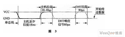 詳細(xì)時序如圖3所示。總線空閑狀態(tài)為高電平。需要讀取DHT11的測量數(shù)據(jù)時,主機先把總線拉低18 ms以上的低電平,這就是主機發(fā)出的開始信號。當(dāng)DHT11檢測到總線上的開始信號時,在主機開始信號結(jié)束后發(fā)送80μs低電平的響應(yīng)信號。主機發(fā)送完開始信號,延時等待20~40μs后,從總線讀取DHT11的響應(yīng)信號。如果讀取響應(yīng)信號為高電平,說明DHT11沒有響應(yīng),請檢查線路是否連接正常。如果總線為低電平,說明DHT11正常發(fā)送了響應(yīng)信號。