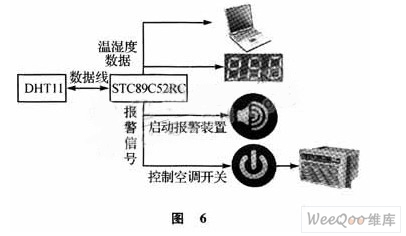 DHT11已被成功地應(yīng)用到了倉庫管理控制系統(tǒng)中。如圖6所示,采用STC89C52RC處理器實現(xiàn)對DHT11的控制,按照DHT11的時序在數(shù)據(jù)線上發(fā)送起始信號,再從數(shù)據(jù)線讀取DHT11的測量數(shù)據(jù)。將這些數(shù)據(jù)進(jìn)行分析處理,一路送至數(shù)碼管顯示,另一路通過RS232口送至計算機。也可以將測量數(shù)據(jù)存入單片機內(nèi)的Flash中,以備查閱。如果測量數(shù)據(jù)顯示當(dāng)前庫內(nèi)的溫濕度超出了倉庫設(shè)定溫濕度范圍,則單片機SFC89C52RC將產(chǎn)生報警信號。將該報警信號一路接人報警裝置中觸發(fā)報警,另一路控制繼電器打開抽濕機和空調(diào)的電源來調(diào)節(jié)庫內(nèi)溫度和濕度。這樣便有效地實現(xiàn)了DHT11對倉庫溫濕度的控制,完善了對倉庫的管理。