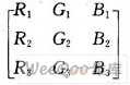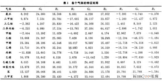 通過(guò)觀察個(gè)硅膠板通氣前后的圖像可知,鎳卟啉對(duì)各氣體均無(wú)顏色變化反應(yīng),所以每幅圖像的有用信息只用銅卟啉溶液滴涂的顏色塊,鋅卟啉溶液滴涂的顏色塊和Pt(Me2bzimpy)Cl+的Cl-鹽溶液滴涂的顏色塊即可表示。對(duì)于每一顏色塊的信息,可用其所有像素的平均R,G,B值來(lái)代表。考慮到具體拍照的光照環(huán)境,配制溶液的濃度以及滴涂時(shí)溶液在硅膠板上的擴(kuò)散程度都會(huì)對(duì)采集到的圖像的亮度和色度產(chǎn)生影響,這里用通氣后像素塊所有像素的平均R,G,B值減通氣前的平均R,G,B值來(lái)代表敏感陣列對(duì)氣體的顏色響應(yīng),因?yàn)橛们昂蟮牟钪挡粌H能抵消光照環(huán)境的影響,而且差值受溶液配制濃度和溶液在硅膠板上擴(kuò)散程度的影響只有原始圖像受這些因素影響的12%。最后可以得到,敏感陣列對(duì)每種氣體的顏色響應(yīng)矩陣,即氣體的特征矩陣: