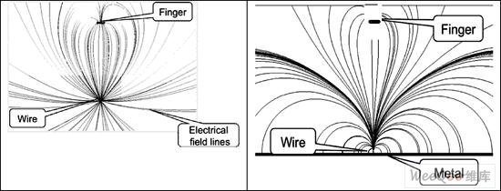 圖4顯示一個在10公分外以手指或手部接近近距感測天線,所形成的電場分布。左圖顯示當近距感測組件沒有受到金屬耦合時的電場分布,而右圖則顯示耦合效應。
