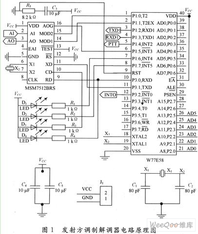 系統(tǒng)使用+5 V的電源由無(wú)線電臺(tái)的電池變換后供給。MSM7512 B使用專用的3.579 545 MHz的晶體,由于其內(nèi)部有接地電容,不用外接補(bǔ)償元件;單片機(jī)使用頻率為11.059 2 MHz的晶體,主要是為了在波特率設(shè)置時(shí),可以取得準(zhǔn)確的波特率,能有效避免定時(shí)器工作產(chǎn)生的積累誤差,外接的補(bǔ)償元件是二個(gè)30 pF電容。為了防止單片機(jī)程序運(yùn)行時(shí)的誤操作,應(yīng)將單片機(jī)EA/VPP端(31腳)置高電平,確保單片機(jī)訪問(wèn)內(nèi)部的程序存儲(chǔ)器。由于調(diào)制解調(diào)芯片MSM7512B和單片機(jī)W77E58都支持TTL電平,所以單片機(jī)的第一串行通信口TXD,RXD可以直接與MSM75125B的XD和RD相連;單片機(jī)的P1.0,P1.1分別連接:MSM7512B的MOD2和MOD1,按通信的要求,在收發(fā)之間轉(zhuǎn)換,以控制調(diào)制解調(diào)芯片的工作狀態(tài);P1.4則控制無(wú)線電臺(tái)收/發(fā)狀態(tài)的轉(zhuǎn)換(PTT)。MSM75125B的AO和AI分別通過(guò)接口電路與無(wú)線電臺(tái)的送/受話器相連。作為系統(tǒng)外部監(jiān)視的顯示電路全部由發(fā)光二極管和電阻構(gòu)成,其中紅色發(fā)光二極管D1為電源指示,亮則表示系統(tǒng)的初始化過(guò)程正確;$發(fā)光二極管D2為發(fā)送正確指示,系統(tǒng)每正確完成一次數(shù)據(jù)發(fā)送任務(wù),它應(yīng)閃爍一次;D3為載波檢測(cè)指示,如果亮則表示調(diào)制解調(diào)器檢測(cè)到了信道中的有效載波信號(hào);D4為數(shù)據(jù)傳輸指示,系統(tǒng)在發(fā)送數(shù)據(jù)時(shí)它就開始閃爍,直至數(shù)據(jù)發(fā)送完畢。如果前端傳感器有數(shù)據(jù)需要傳送時(shí),產(chǎn)生一個(gè)下降沿脈沖,觸發(fā)單片機(jī)的外部中斷INTO(P3.2),單片機(jī)響應(yīng)中斷后,將前方來(lái)的8位并行數(shù)據(jù)由P2口(P2.0~P2.5)讀入,由于P2口內(nèi)部有上拉電阻,因此作為輸入口時(shí),可用TTL或MOS電路驅(qū)動(dòng),而不要外加上拉電阻。W77E58的串行通信口2可留作系統(tǒng)的擴(kuò)展口備用。