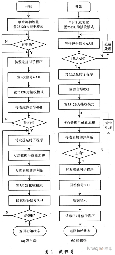 在系統(tǒng)的設(shè)計(jì)過(guò)程中,為了減少電臺(tái)靈敏度不高和信道質(zhì)量差誤碼等影響,發(fā)送方需連續(xù)發(fā)5次“握手”聯(lián)絡(luò)信號(hào),接收方在連續(xù)2次收到正確的聯(lián)絡(luò)信號(hào)以后,才確認(rèn)是有效的聯(lián)絡(luò)予以響應(yīng),否則認(rèn)為是干擾信號(hào),不予以響應(yīng)。這樣既能減少各類原因造成的接收機(jī)程序不啟動(dòng)運(yùn)行導(dǎo)致漏報(bào)的可能性,又能保證接收機(jī)不因干擾信號(hào)而誤操作,減少誤報(bào)的機(jī)率。另外綜合考慮電臺(tái)的收發(fā)轉(zhuǎn)換和調(diào)制解調(diào)芯片的收發(fā)轉(zhuǎn)化所需的各類延時(shí)時(shí)間,在設(shè)計(jì)程序時(shí)專門安排了一個(gè)延時(shí)時(shí)間。經(jīng)過(guò)大量的實(shí)驗(yàn),得出一個(gè)比較合適的延時(shí)時(shí)間,即不論通信哪一方,在由收轉(zhuǎn)為發(fā)狀態(tài)后,都先延時(shí)70 ms,因?yàn)闀r(shí)間太短了系統(tǒng)不能正常工作,太長(zhǎng)了可能會(huì)影響數(shù)據(jù)的傳輸速率,降低數(shù)據(jù)傳輸?shù)臅r(shí)性。系統(tǒng)數(shù)據(jù)發(fā)射端和接收端單片機(jī)程序流程圖如圖4所示。