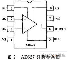 AD627是一種低功耗的儀表放大器。他采用單、雙兩種電源供電,并可實(shí)現(xiàn)軌-軌輸出。AD627在85 uA的電流下即可正常工作,并具有極佳的交流和直流特性。AD627采用工業(yè)標(biāo)準(zhǔn)8腳封裝,引腳排列圖如圖2所示。