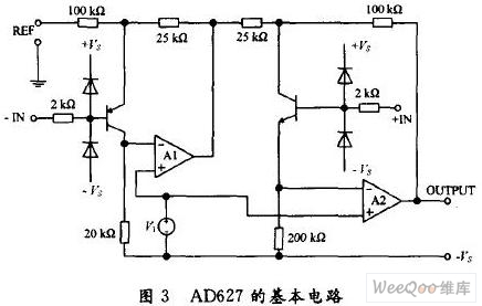AD627的最大特點(diǎn)是允許用戶使用一個(gè)外部電阻器來設(shè)定增益。AD627的失調(diào)電壓、失調(diào)漂移、增益誤差和增益漂移均較低,因此,AD627可將用戶系統(tǒng)的直流誤差降到最低。由于有較好的高頻共模抑制比,AD627可保持最小的高頻誤差,也正是因?yàn)锳D627具有較高的CMRR特性(可高達(dá)200 Hz),從而使得傳輸線干擾和傳輸線諧波等都被排斥掉了。AD627采用真正的儀用放大器結(jié)構(gòu),他有兩個(gè)反饋環(huán)。其基本結(jié)構(gòu)和典型的“雙運(yùn)放”儀用放大器類似,只是細(xì)節(jié)有所不同。另外,AD627所具有的一個(gè)“電流反饋”結(jié)構(gòu),使得AD627具有較好的共模抑制比。AD627的基本電路見圖3所示。其中A1與V1,R5構(gòu)成了第一個(gè)反饋回路,通過該回路可在Q1上得到穩(wěn)定的集電極電流(假設(shè)增益設(shè)定電阻此時(shí)不存在)。電阻R1和R2組成的反饋環(huán)可使A1的輸出電壓和反向端電壓相等。通過A2可形成另一個(gè)幾乎完全相同的反饋環(huán),他可使Q2的電流和Q1相等,同時(shí)A2還可提供輸出電壓。當(dāng)兩個(gè)環(huán)平衡時(shí),同向端到VOUT的增益為5,A1輸出到VOUT的增益為-4,A1的反向端增益是A2增益的1.25倍。AD627差動(dòng)模式時(shí)的增益為1+R4/R3,額定值為5。AD627是通過電阻RG來設(shè)定增益的。