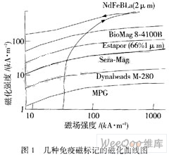 免疫磁性微球,或稱免疫磁標(biāo)記,是表面結(jié)合有單克隆抗體的磁性微球,是近年來國(guó)內(nèi)外研究比較熱門的一種新的免疫學(xué)技術(shù)它以免疫學(xué)為基礎(chǔ),滲透到病理、生理、藥理、微生物、生化及分子遺傳學(xué)等各個(gè)領(lǐng)域,其應(yīng)用口益廣泛,尤其在免疫學(xué)檢測(cè)、細(xì)胞分離、蛋白質(zhì)純化等方面取得巨大的進(jìn)展現(xiàn)在國(guó)外已經(jīng)有多家公司專門生產(chǎn)磁標(biāo)記產(chǎn)品,如比較著名的Dynal,Nanomag,Micromer公司等國(guó)內(nèi)生產(chǎn)該方面產(chǎn)品的公司有寧波新芝生物科技股份有限公司、杭州聯(lián)科生物技術(shù)有限公司、深圳納微生物科技有限公司等圖1是一些免疫磁標(biāo)記的磁化曲線,其中,Dynal公司的M-280是目前最常用于GMR生物傳感器檢測(cè)的免疫磁標(biāo)記,直徑2.8μm,具有超順磁性。