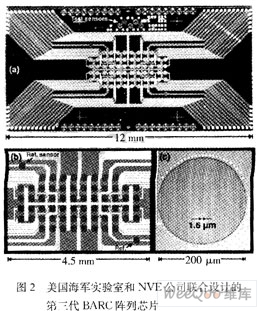 美國(guó)海軍實(shí)驗(yàn)室于1998年率先提出利用GMR效應(yīng)和免疫磁標(biāo)記實(shí)現(xiàn)GMR牛物傳感器的設(shè)想他們通過測(cè)量DNA、抗原-抗體、施體和受體等的實(shí)驗(yàn),證明了其原理的可行性,從而進(jìn)一步提出了磁標(biāo)記陣列計(jì)數(shù)器(BARC),并研制出DNA陣列芯片圖2是美圍海軍實(shí)驗(yàn)室和NVE公司聯(lián)合設(shè)計(jì)的第三代BARC陣列芯片,其平面布局如圖2(a)所示,圖2(b)是圖2(a)的局部放大,它采用半導(dǎo)體工藝在硅基片上集成了64路GMR傳感器,每一路傳感器都是由總長(zhǎng)為8 mm、寬為1.6μm磁阻條來回曲折地分布在直徑為200μm的圓形區(qū)域內(nèi)(圖2(c)),其磁電阻值為42 kΩ,飽和磁化強(qiáng)度和GMR效應(yīng)(△R/R)分別為30 mT和15%,每一個(gè)傳感器可以單獨(dú)完成一種檢測(cè)傳感器采用磁性層/非磁性層/磁性層的多層膜結(jié)構(gòu),被非磁性層隔開的兩個(gè)磁性層之間反平行耦合。