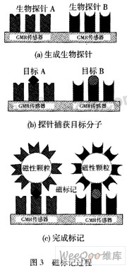 GMR傳感器檢測(cè)過程如圖3所示首先,在傳感器表面生成用于特定檢測(cè)的生物探針(圖3(a)),再使檢測(cè)試液流過傳感器表面,試液中特定的目標(biāo)分子將被探針捕獲(圖3(b)),然后加入免疫磁性微球,免疫磁性微球與目標(biāo)分子發(fā)生作用完成標(biāo)記(圖3(c))此時(shí),需要采用垂直于傳感器表面的外加梯度磁場(chǎng)將未參與標(biāo)記的多余免疫磁性微球分離,這樣可以減小檢測(cè)時(shí)的背景噪聲,從而提高檢測(cè)的精確度然后,再用外加的交變磁場(chǎng)將磁標(biāo)記磁化,磁化的磁標(biāo)記產(chǎn)生的附加交變磁場(chǎng)引起傳感器磁電阻的變化,通過讀取磁電阻的變化可以判定待檢試液中是否有目標(biāo)分子,并根據(jù)磁電阻變化的幅度可以判斷待檢試液中目標(biāo)分子的濃度等情況。