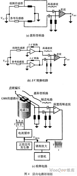 磁電阻的變化需要轉(zhuǎn)化成電信號(hào),有兩種實(shí)現(xiàn)方式,一是惠斯登橋路結(jié)構(gòu),如圖4(a)所示,另一種是采用I-V轉(zhuǎn)換法,如圖4(b)所示。