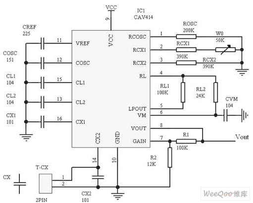 油水界面探測器的關(guān)鍵器件是電容信號調(diào)理電路CAV414。CAV414是一種專為電容傳感器而設(shè)計(jì)的通用性強(qiáng)、多用途集成電路,該芯片內(nèi)包含有完整的信號處理單元。(見圖二)CAV414芯片內(nèi)含基準(zhǔn)振蕩器,其振蕩頻率可由基準(zhǔn)振蕩電容Cosc和Rosc來調(diào)整,基準(zhǔn)振蕩器驅(qū)動2個(gè)同步積分器,而在電阻(Rcx1+W0)和Rcx2值相同時(shí),電容Cx1和(Cx2+Cx)則決定2個(gè)被驅(qū)動的積分器的積分電壓幅度,即積分器的積分電壓幅度差別反映了電容Cx1和(Cx2+Cx)的相對容量差。CAV414具有很高的共模抑制比和分辯率。它的差分信號端可由低通濾波器來進(jìn)行處理和限定,而低通濾波器的角頻率和增益也由幾個(gè)外接元器件來調(diào)節(jié),輸出信號幅度也可由內(nèi)部放大器進(jìn)行預(yù)放大,放大倍數(shù)可由RL1/RL2及R1/R2確定。