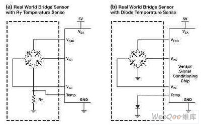 PGA309 是典型的信號(hào)調(diào)節(jié)片上系統(tǒng),它可用于補(bǔ)償溫度漂移和阻性橋傳感器的非線性。圖1a為橋傳感器實(shí)例,其溫度系數(shù)將用于確定電阻電 壓(Rt)。Rt上的電壓為溫度信號(hào)。仿真器可模擬Rt溫度感應(yīng)方法,它提供一個(gè)可編程溫度信號(hào),根據(jù)溫度信號(hào)調(diào)制橋電壓。該傳感器仿真器還可模擬圖1b 的電路,該圖中二極管用于測(cè)量橋溫度。